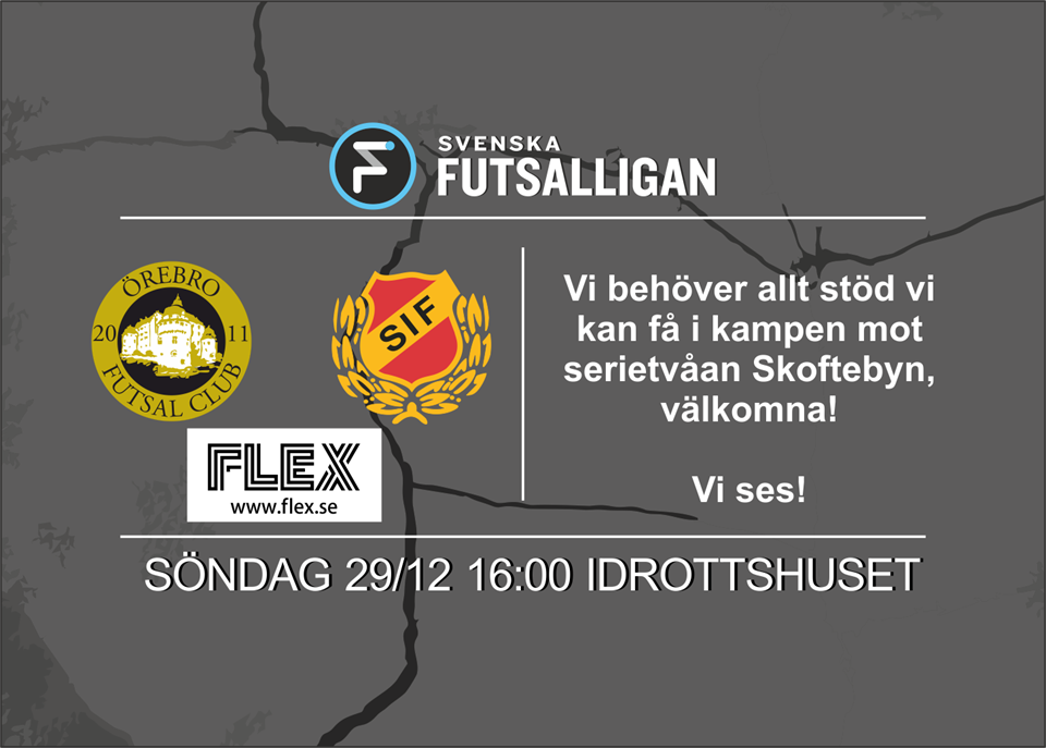 Matchen mot Skoftebyn på söndag 29/12 kl.16:00 kommer att bli en tuff kamp om poängen, så nu behöver vi ditt stöd på läktaren. Skoftebyn går som tåget och vi måste prestera på topp för att ta poäng. Våra spelare presterar bättre ju fler som är på läktaren så ta med en kompis, heja fram laget och upplev mellandagsfutsal när den är som bäst. Matchvärd är FLEX Interior Systems AB och Itfokus håller som vanligt med ett fint pris till någon i publiken. Varmt välkomna!