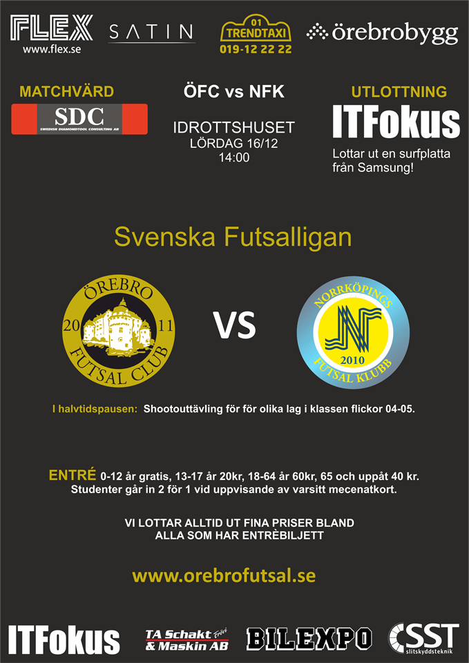 På lördag 16/12 kl:14:00 i idrottshuset smäller det! I en tidig seriefinal tar vi emot Norrköpings FK som öppnat serien starkt och ligger 2.a i tabellen. I ÖFC lägret rapporteras alla spelare vara tillgängliga och vara rejält taggade inför absolut bästa tänkbara motståndet. Norrköping har ett par riktigt bra nyförvärv för säsongen som är riktigt sevärda så missa inte matchen mellan 1:an och 2:an i SFL Norra. Precis som vanligt hoppas vi verkligen att du har möjlighet att stötta oss på plats, likt föregående matcher! Mycket folk och bra drag på läktarn, höjer våra spelare markant och hjälper oss i kampen om poängen! Ann-Britt Arvidsson hade önskemål om lägre entré för pensionärer, därför sänker vi nu priset från 60kr till 40kr från 65år och uppåt. Hoppas det passar fler pensionärer, och ni är som sagt lika välkomna som alla andra. Naturligtvis kör vi vidare på succén med shootout tävling i halvtidspausen där vinnande laget vinner 500kr till lagkassan. Den här gången är det fotbollstjejer i åldersklassen F04-05 som gör upp om segern och i skrivande stund har vi 4 olika lag klara. Självklart går det bra att anmäla sig till utlottningen av 1500kr + halsdukar för barn/ungdomslag. Förutsättningarna för att delta i utlottningen hittar ni Här Vi lottar som vanligt ut grymma priser och bla kommer ITFokus att lotta ut en surfplatta bland alla som har köpt en entrébiljett. Matchvärd är SDC (Swedish Diamondtool Consulting) Hoppas vi ses på lördag & varmt välkomna! /GM