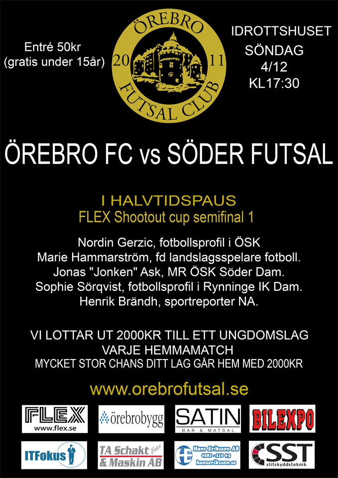 På söndag behöver vi dig på plats när ÖFC tar emot Söder futsal i kampen om tre nya poäng. I halvtid bjuder vi på FLEX Shootout Cup där vi får se ett stjärnspäckat startfält göra upp om de två första platserna i semifinal 1. Vilka vinner och vilka försvinner?! Nordin Gerzic, fotbollsprofil i ÖSK. Marie Hammarström, fd landslagsspelare fotboll. Jonas "Jonken" Ask, MR ÖSK Söder Dam. Sophie Sörqvist, fotbollsprofil i Rynninge IK Dam. Henrik Brändh, sportreporter NA. Vi har öppnat säsongen starkt och är med i tabelltoppen så kom gärna och gör oss ännu bättre. När: Söndag 4/12 Tid: 17:30 Plats: Idrottshuset
