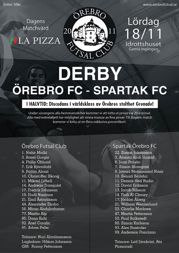 Äntligen dags för säsongens första derby mellan Örebro FC vs Spartak ÖFC. Kom och skapa den ultimata derbystämningen nu på onsdag 18/11 kl:19:00 i Idrottshuset. Som vanligt så lottar vi ut fina priser på entrébiljetten, var 20:e minut. Och Du, GRENADE kommer också. I halvtid för vi uppleva discodans i världsklass av dansgruppen GRENADE! Till sist, kom i tid så du inte missar vårt stämningshöjande intro, där du är viktigast, börjar 18:56! Just ja, det går naturligtvis att betala med Swish. Vi möter kanske det bästa laget i SFL norra för tillfället, Spartak Örebro. Laget har fått en grym start på serien med bara segrar och öst in över åtta mål i snitt/match. Vi tog vår första seger i onsdags och känner att vi är på rätt väg, även om vi har en bit kvar innan vi peakar. Men, vi är taggade och ska göra allt för att få med oss poäng. Vi slår ur underläge, ett derby är ett derby, och inom idrottens värld kan som bekant allt hända. En förutsättning för att vi ska ha en bra chans är att just DU tar med dig några kompisar, laddar och kommer för att stötta oss i kampen om poängen! Nu köööör vi! #forzaöfc #futswe Tack för ditt stöd och varmt välkommen!