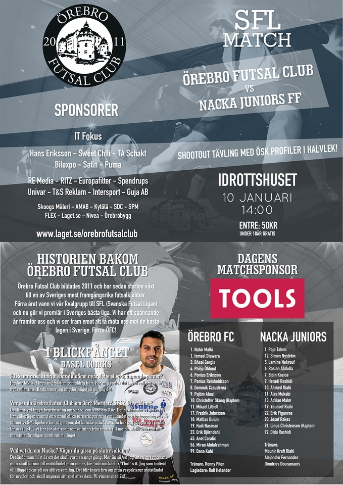 Mötet mot serieledarna blev en match som svängde i målskyttet. Vi kan göra 1-0 redan efter 15 sek och har sen ledningen tills det återstår 28 sek då vi släpper in 6-6. Jag förstår att just Nacka leder serien då de har många individuellt duktiga spelare, spelar en offensiv futsal och gör många mål. Vi hade vår taktik klar och den fungerade bra. Vi har 4-1 i halvtid och fått matchen dit vi vill. Med 1 min kvar av första har vi ett jättefint anfall med två avslut på mål, men målvakten gör en dubbelräddning. Där skulle man kunna tro att om vi gjort 5-1, skulle det varit matchavgörande. Men i stället påstår jag, som aldrig i hela mitt liv klagat på en domare, att en av domarna avgör matchen på egen hand. Så uppenbara felbeslut får inte tas i allsvenskan utan där måste lagen få spela om poängen. De andra två domarna gör en bra match och vi ska inte älta det här mer, utan göra en skrivelse till förbundet. Andra halvan är bara 2 min gammal när vi mycket oturligt gör ett självmål, inget att säga om när man i sitt hemjobb för ett hårt inspel framför mål, bollen träffar foten och i mål. Kan säga att det var Niklas Johansson som var otursgubben där. Niklas var också väldigt lyckosam framåt med sina 3 mål så, 4-målskytt blir man inte varje match. Uret står på 12,30 kvar att spela när Nahir gör sitt första och enda misstag i matchen. En höjdboll kommer in i boxen, Nahir går ut, blir säkert lite distraherad av motspelaren så han tar varken bollen eller spelaren och motståndaren kan nicka in 4-3 i öppet mål. Ingen skugga faller över Nahir som var riktigt bra idag. Sen går det 1,30 min och vi gör ett snyggt mål där Dana blir serverad av Bulun, och vi har 5-3. Minuten efter släpper vi in 5-4 och det börjar bli lite nervöst. Med 4,40 kvar gör vi ett snyggt frisparksmål och har ledning med 6-4. Nu kändes det riktigt bra men det skulle snart bli sämre. Nacka tar time-out. Vi vet att dem kommer plocka målvakten och vi vet vad vi ska göra. Med 2,29 kvar kan gästerna göra 6-5, efter att fått en inspark...som vi uppenbart skulle haft. Sen med 28 sek kvar av matchen misslyckas vi lite med vår höga press, vi släpper ytor till gaästerna som kan göra 6-6. I andra halvlek har vi 5-6 frilägen med målvakten, men någon tar stolpe ut och några går precis utanför stolpen. Dessutom slår Mirre mot öppet mål i slutet när motståndarna har plockat målvakten, vad händer, jo stolpe ut. Hade vi gjort ett mål på alla dessa chanser hade vi kunnat avgjort själva. Nu blev det inte så utan 6-6 känns som en förlust när man varit i ledningen matchen igenom...utom 43 sekunder. Thats life, vi slickar såren, skriver lite och kommer igen. Stort TACK till alla som ställer upp och gör vårt matcharrangemang såå bra. Tack också till ÖSK som släppte fram Jakob Rinne & Kalle Holmberg i shootouttävlingen i halvtid. Vem som vann...det gjorde Jakob Rinne som fick ett presentkort på Java. Tack också till dagens matchvärd TOOLS i Örebro. Hoppas vi ses nästa söndag, då vi tar emot Linköping i Idrottshuset 15:00. 1-0 19,45 Mirre 2-0 14,25 Niklas, ass Bulun 2-1 12,42 3-1 3,38 Dana 4-1 0,52 Niklas, ass Dana ----------- 4-2 18,13 4-3 12,30 5-3 11,00 Dana, ass Bulun 5-4 9,51 6-4 4,40 Niklas, ass Basel 6-5 2,29 6-6 0,28 /Pilen